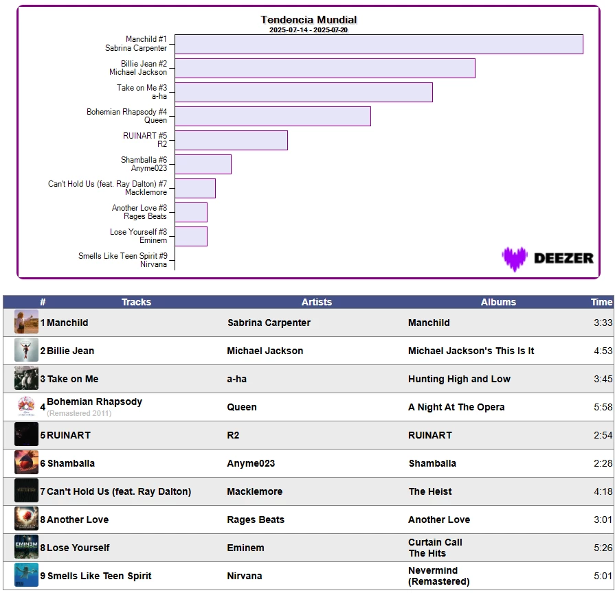 📊 Análisis de canciones n. 26 Tendencia Mundial en Deezer Semana 29/2025 🌍