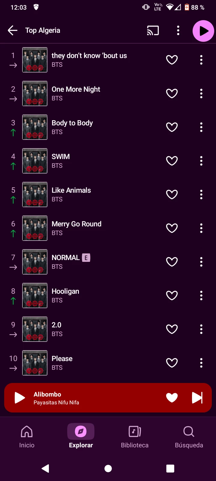 Este chart de Argelia compuesto en su totalidad por canciones de BTS es un gran aporte a mi conocimiento musical por su variedad de géneros musicales mezclados con el K-pop. Todas las canciones están siendo recomendadas.