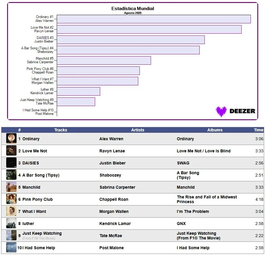 📊 Análisis de canciones n. 41 Estadística Mundial en Deezer Agosto 2025 🌍