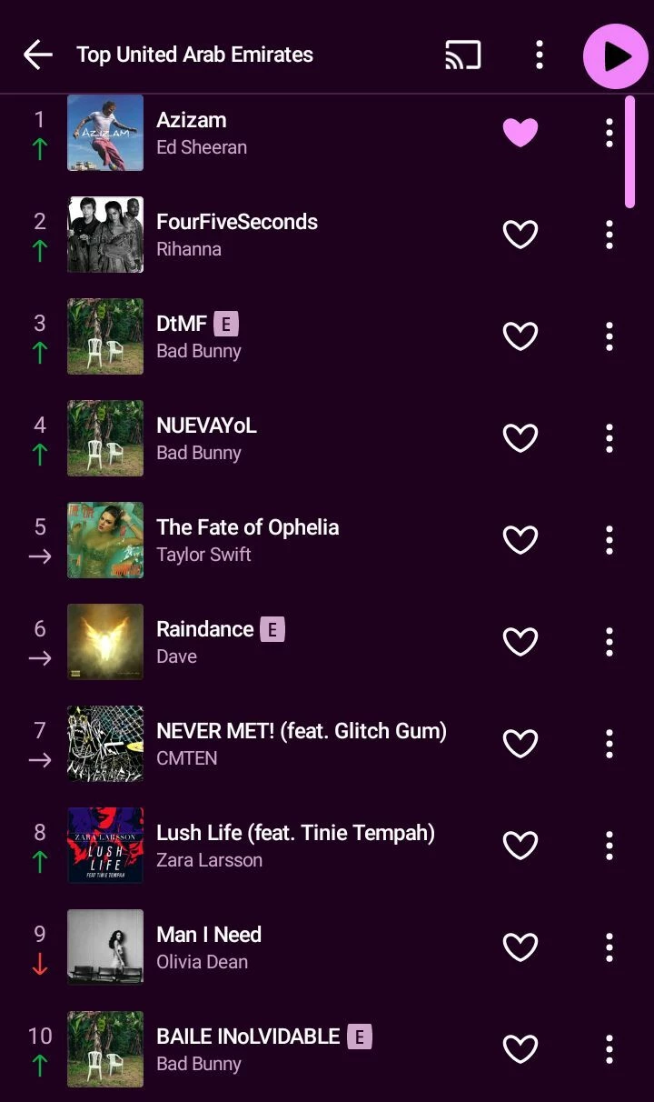 Análisis de canciones n. 9 Chart de Emiratos Árabes Unidos 🇦🇪 9/febrero/2026