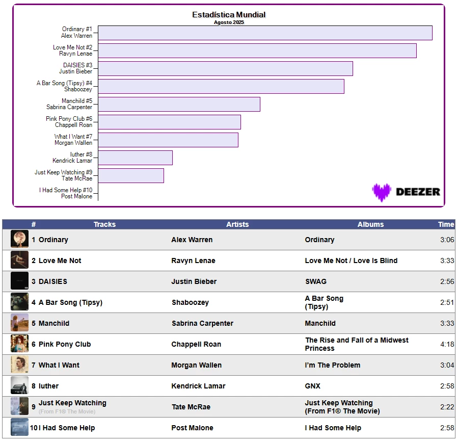 📈🏆 Estadística Mundial en Deezer Agosto 2025 📈