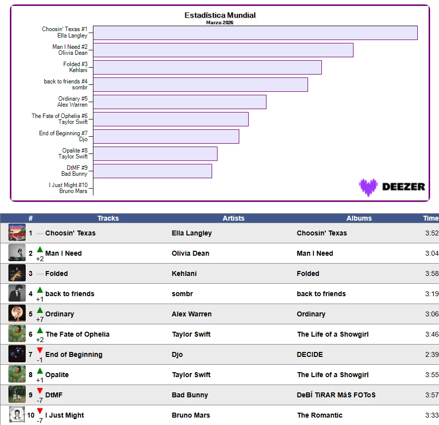 📈🏆 Estadística Mundial en Deezer Marzo 2026 📈