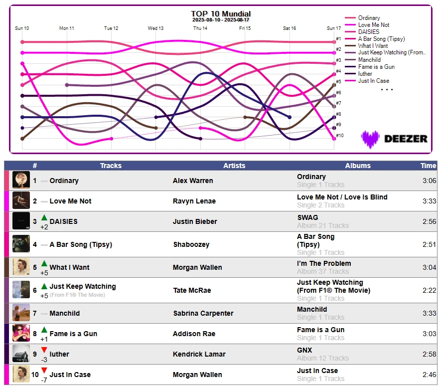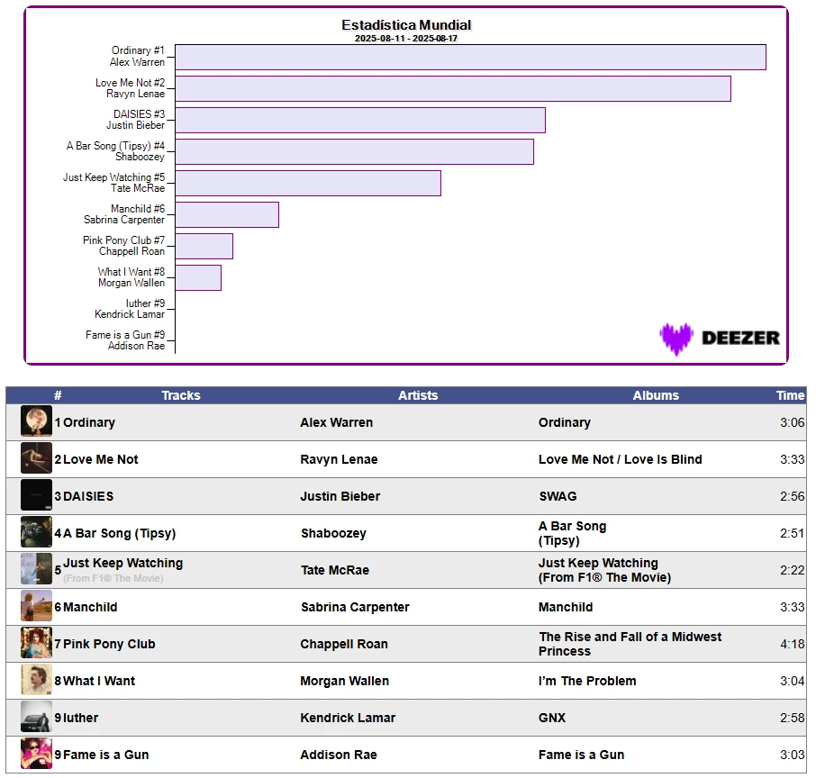 📈 🏆 Estadística Mundial en Deezer Semana 33/2025 📈 17/agosto/2025