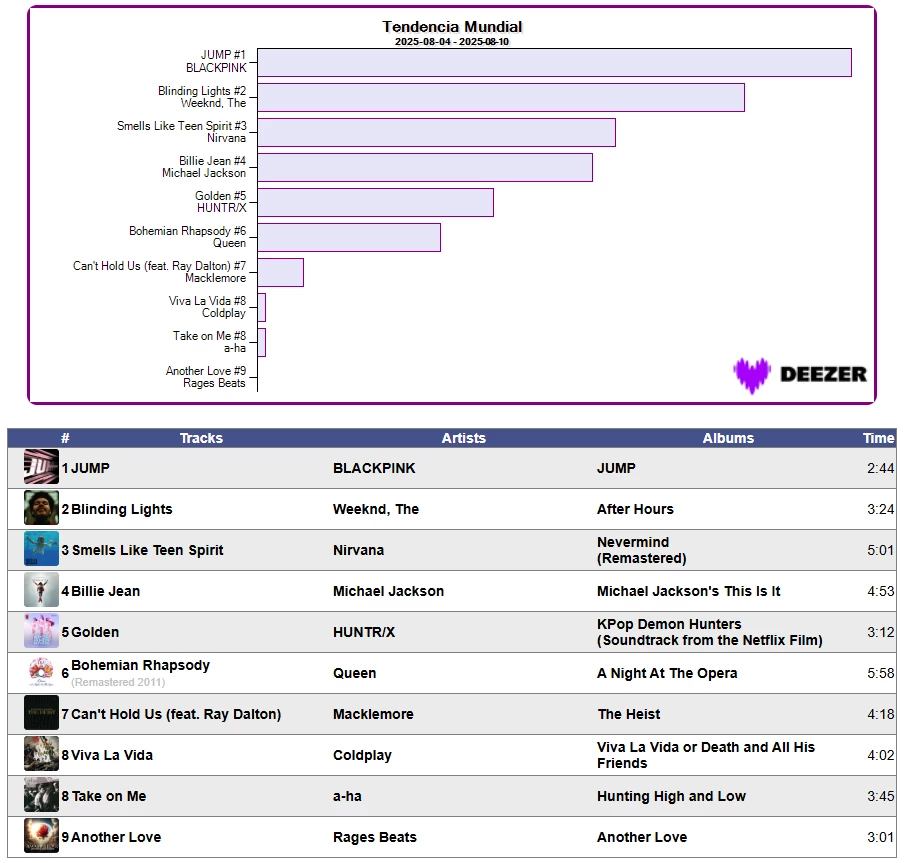 📈👉 Tendencia Mundial en Deezer Semana 32/2025 📈 10/08/2025