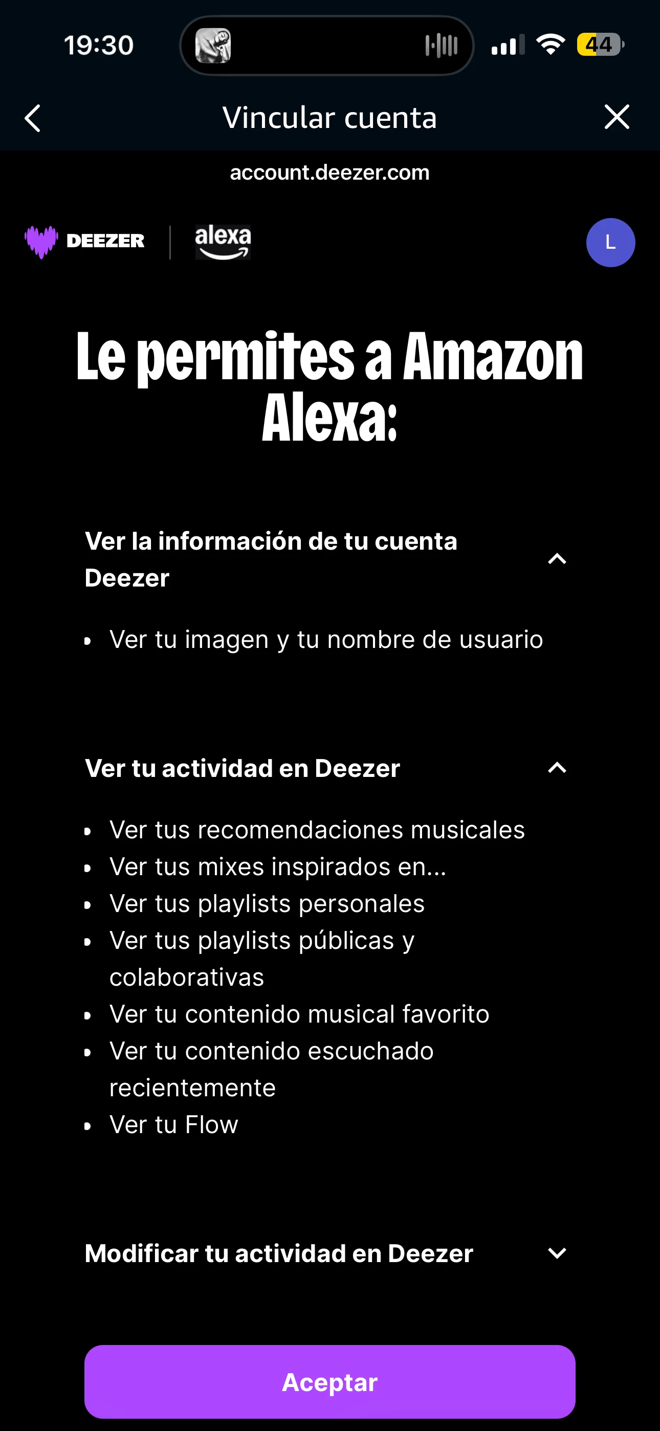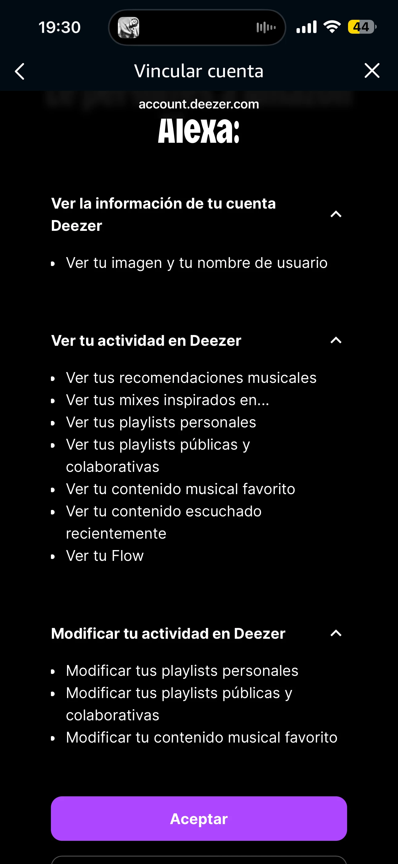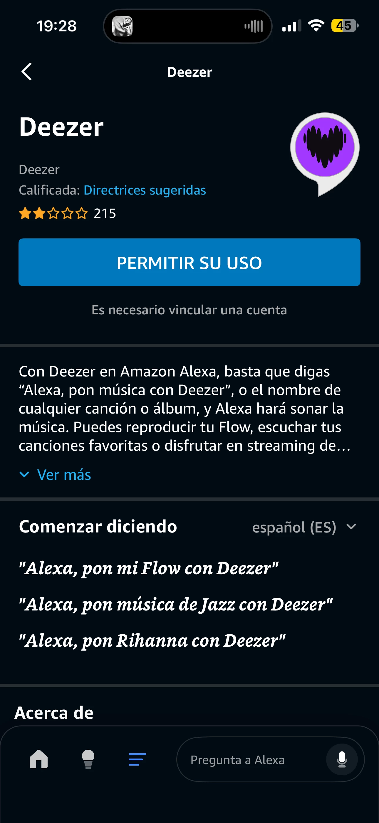 Cuando le das a permitir su uso, te carga la página de Deezer para poner las credenciales...
