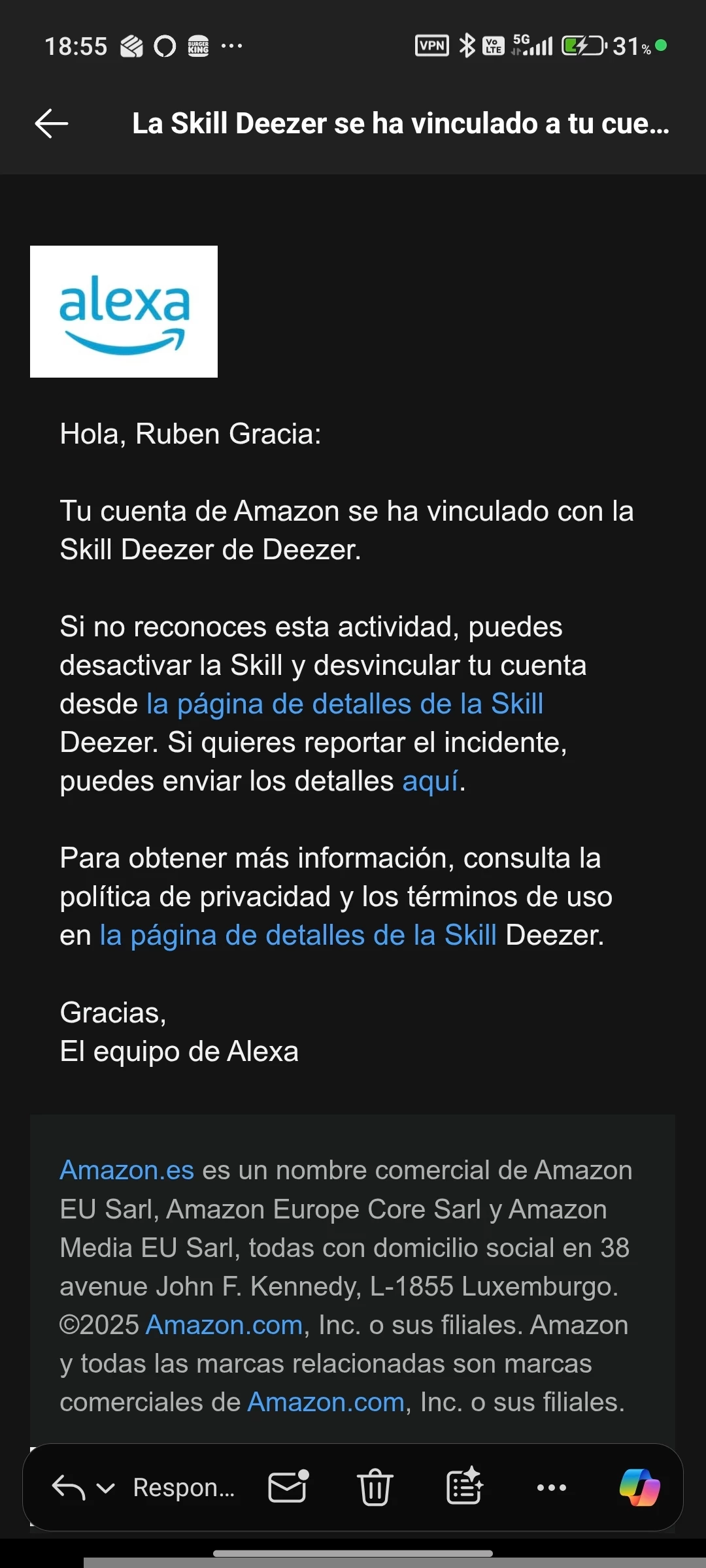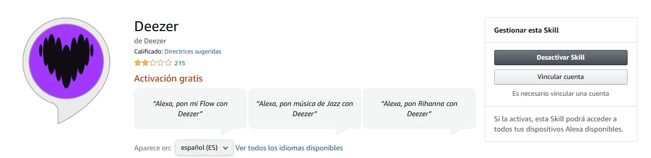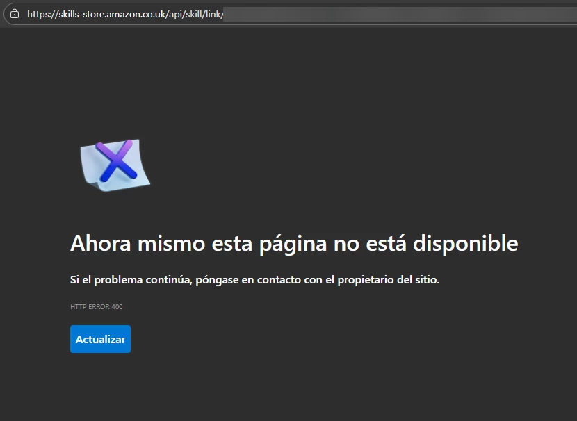 Recibí un correo de Deezer diciendo que habían mejorado la integración con Alexa. Que volviera a vincular la cuenta. Se me habré la página de web de layla.amazon.com, luego Deezer, inicio sesión y luego ya no puedo hacer nada más. Se queda en la web skills-store.amazon.co.uk con el error 404 lo he probado varias veces y nada.