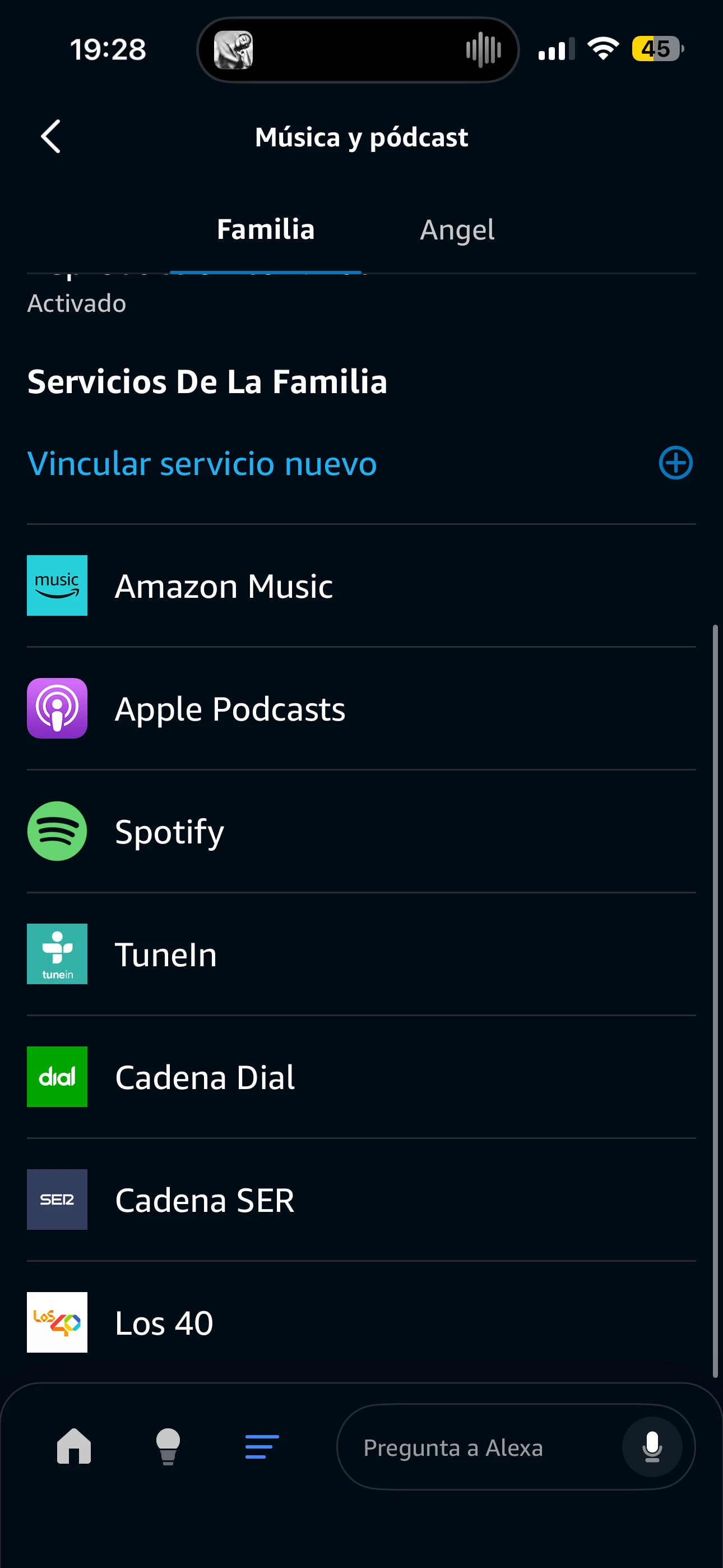 Desde la App de Alexa vas al apartado de música y pódcast y ahí verás los servicios que tienes vinculados. Le das al más para vincular nuevo servicio...