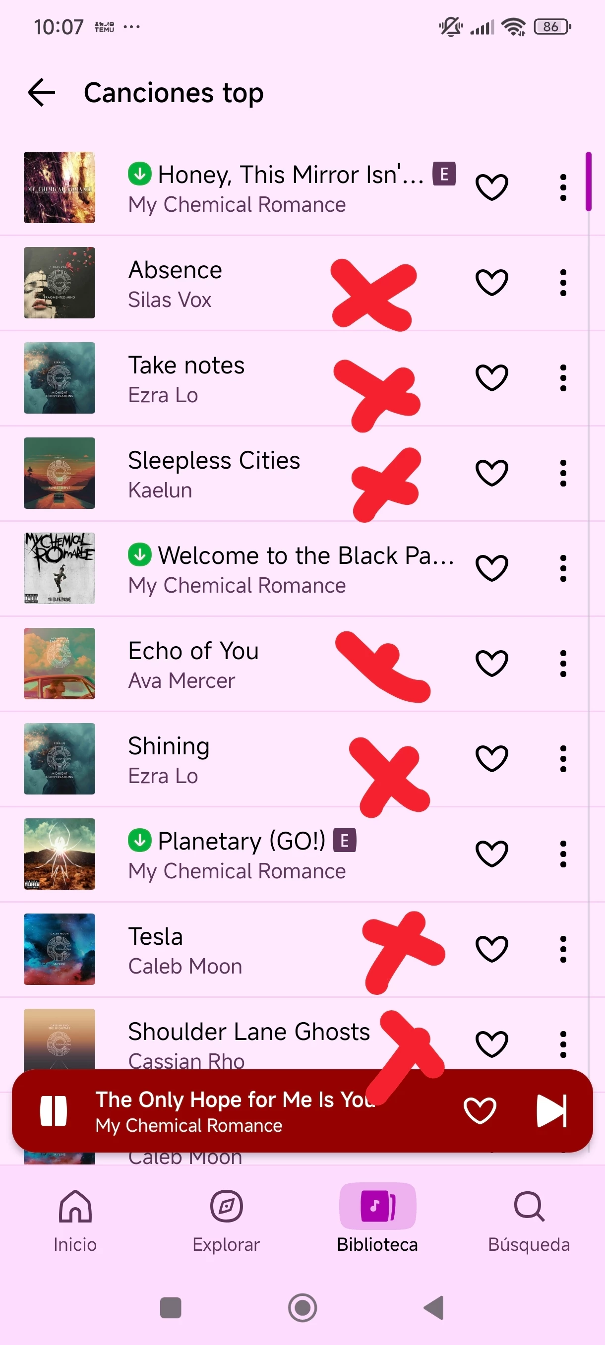 Y aquí están mis canciones top. Todas las marcadas son canciones que nunca escuché