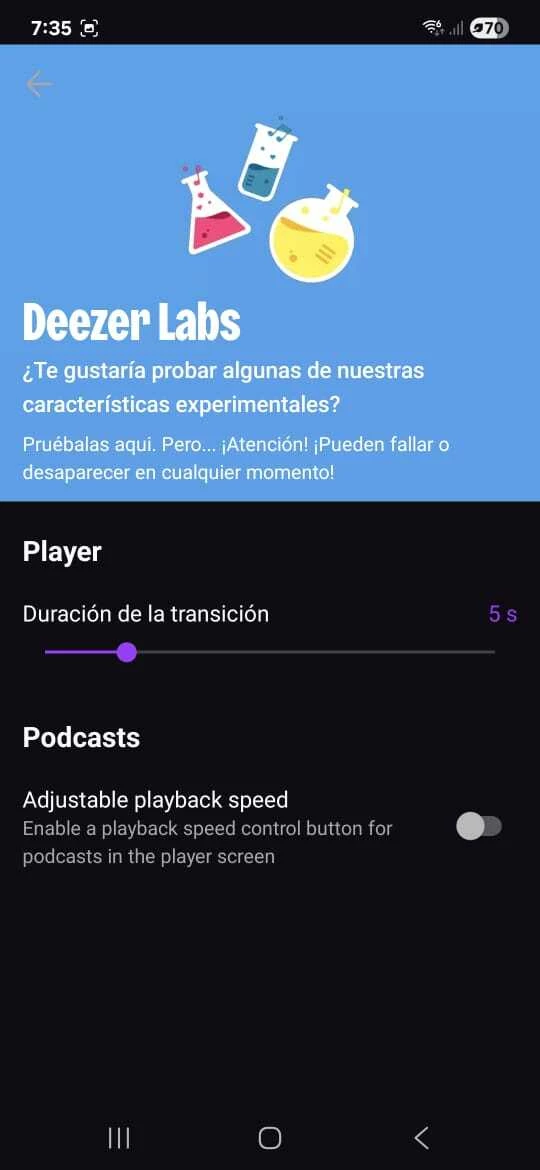 4. Dentro de Deezer Labs, busca la opción Duración de la transición.