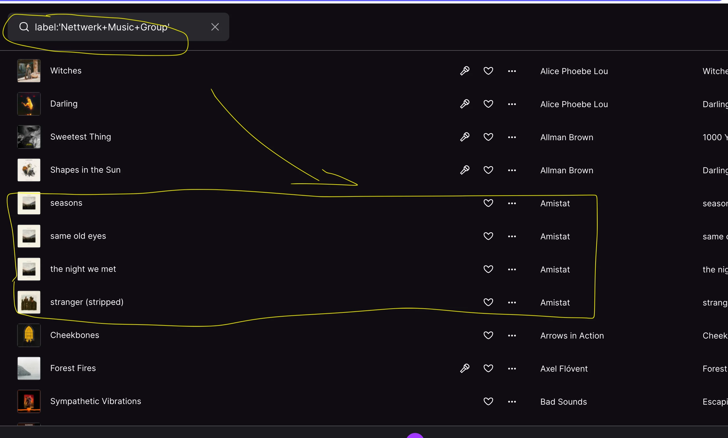 Y yo pongo cómo lo has dicho, los espacios substituidos por %20 y me sale una lista de canciones pero muy cortita. No sé esas canciones cómo están ordenadas y tampoco por qué es tan escueta, cuando el sello todas las semanas publica cosas y artistas nuevos… De hecho el grupo Amistat no aparece en esa lista...