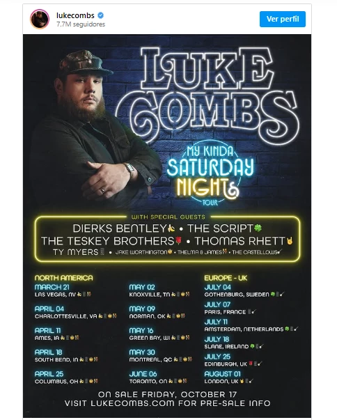 La amplia serie de espectáculos presenta fechas en América del Norte, Canadá y Europa, con Combs encabezando una gran cantidad de lugares colosales mientras se consolida como una de las principales figuras de la música country. El creador de éxitos de 'Hurricane' llevará su arsenal de baladas conmovedoras e himnos de cervezas en el aire a Ohio, Nevada, Iowa, Tennessee y más, además de cruzar The Pond para actuar en países como el Reino Unido, Irlanda, Francia, Suecia y los Países Bajos.