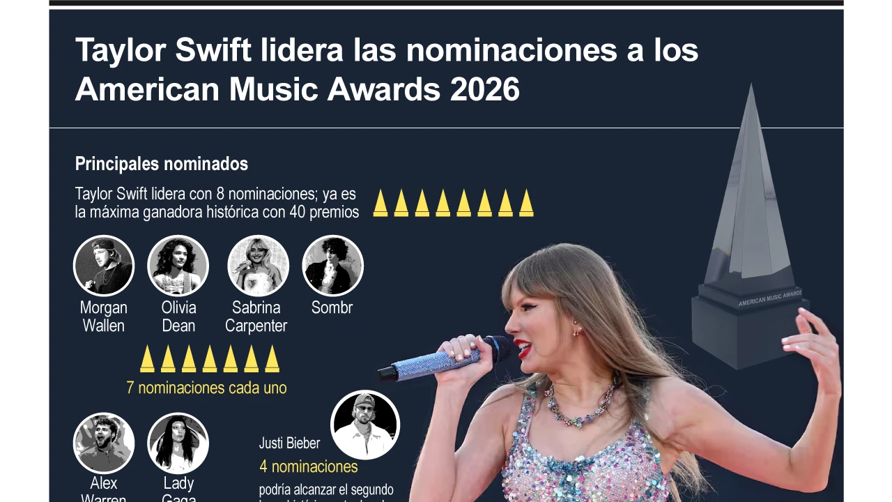 Los American Music Awards volverán este año para su 52ª edición, que comenzará el 25 de mayo en el MGM Grand Garden Area de Las Vegas. Taylor Swift lidera con ocho nominaciones, incluyendo Artista del Año, Álbum del Año y Canción del Año. La estrella del pop está seguida por Sabrina Carpenter, Morgan Wallen, Olivia Dean y Sombr, con siete nominaciones cada una.