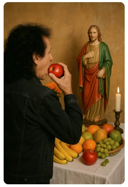 Justo cuando Alex Lora le iba a dar un buen tarascón a una de las frutas, el encargado del local lo paró en seco y le explicó que no se la podía comer, ¡que era para el santo!