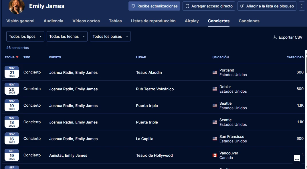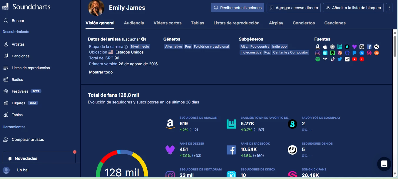 Mirad como ejemplo he cogido a la artista Emily James y la verdad es que la versión gratuita te da mucha información de los artistas…