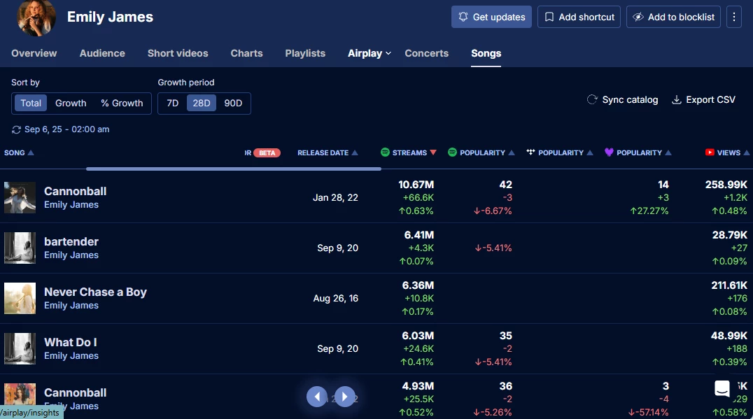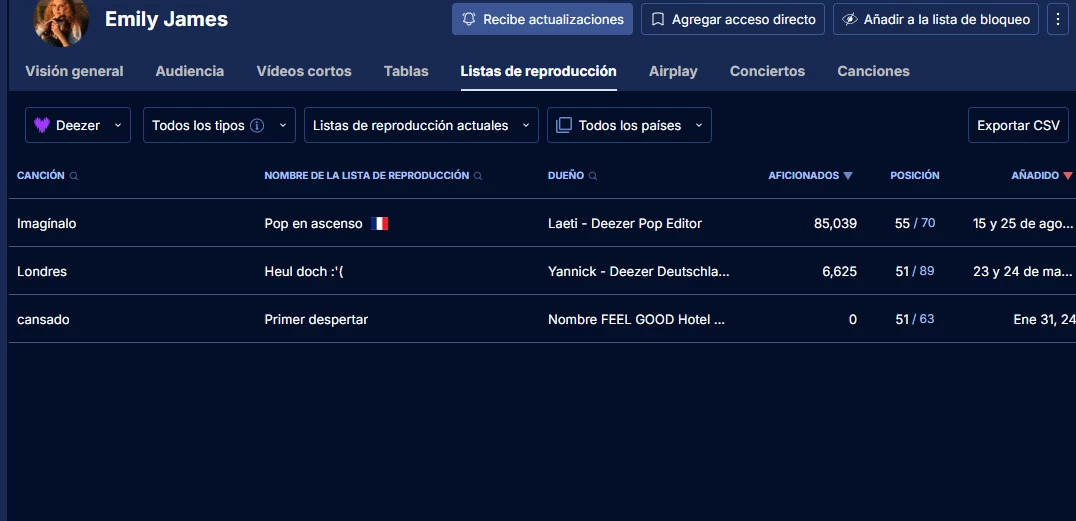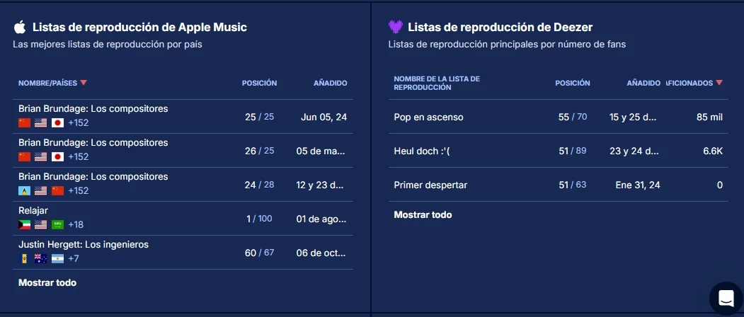 Soundcharts realmente te da una imagen clara del panorama musical global, lo que sube, lo que baja, la búsqueda de canciones de tendencia, el seguimiento de tu propia lista, la alerta en tiempo real, simplemente funciona.