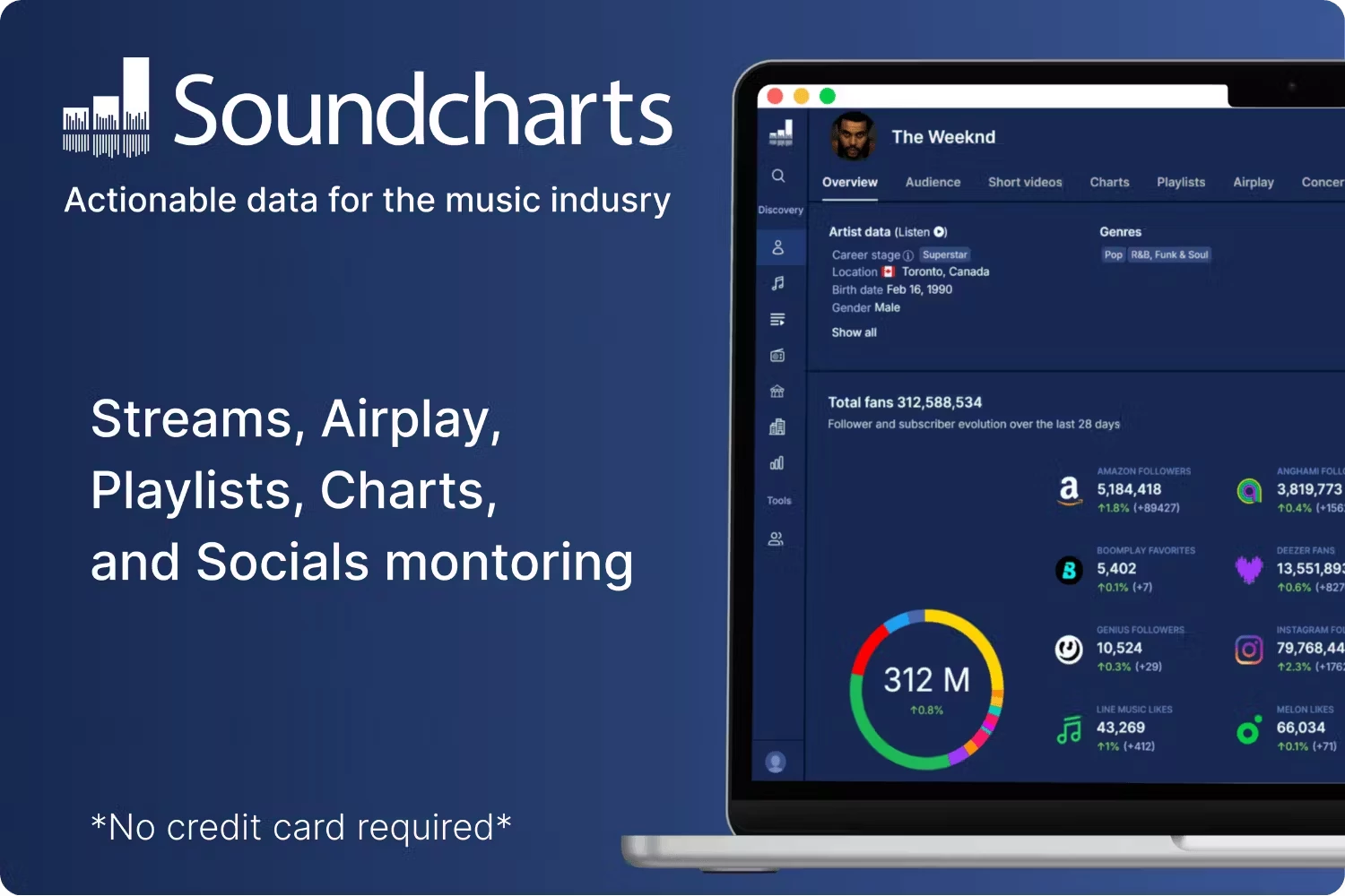Lanzada en 2016, Soundcharts es la plataforma líder mundial de inteligencia de mercado para la industria musical, utilizada por miles de profesionales de la música en todo el mundo (artistas, managers, sellos discográficos, editores, distribuidores, agentes, festivales, marcas y agencias). La compañía ofrece análisis de datos globales y en tiempo real sobre el rendimiento de los artistas y las tendencias del mercado mediante el seguimiento de emisoras de radio, listas de reproducción, listas de éxitos, redes sociales y medios online a nivel mundial.