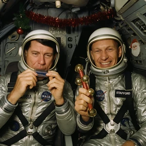 En 1965, los astronautas Wally Schirra y Thomas Stafford hicieron historia en la misión Gemini 6A al tocar la primera canción con instrumentos... ¡en el espacio! Era Navidad, así que decidieron llevar una armónica y cascabeles escondidos para interpretar “Jingle Bells” mientras flotaban en gravedad cero. Todo fue una broma para el centro de control en Houston, y funcionó: los hicieron reír desde el espacio.