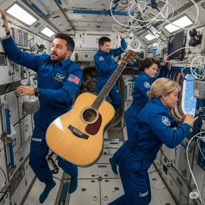 Ya en la ISS (Estación Espacial Internacional), los astronautas pasan meses viviendo allá arriba. Así que, como en cualquier casa, también tienen instrumentos. Hay una guitarra acústica flotando por ahí, y más de uno ha grabado canciones para pasar el rato.