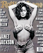 Janet Jackson aparece sin camisa en la portada de Rolling Stone. Sus brazos están en el aire, con sus tetas sostenidas por un par de manos que pertenecen a su esposo, René Elizondo.