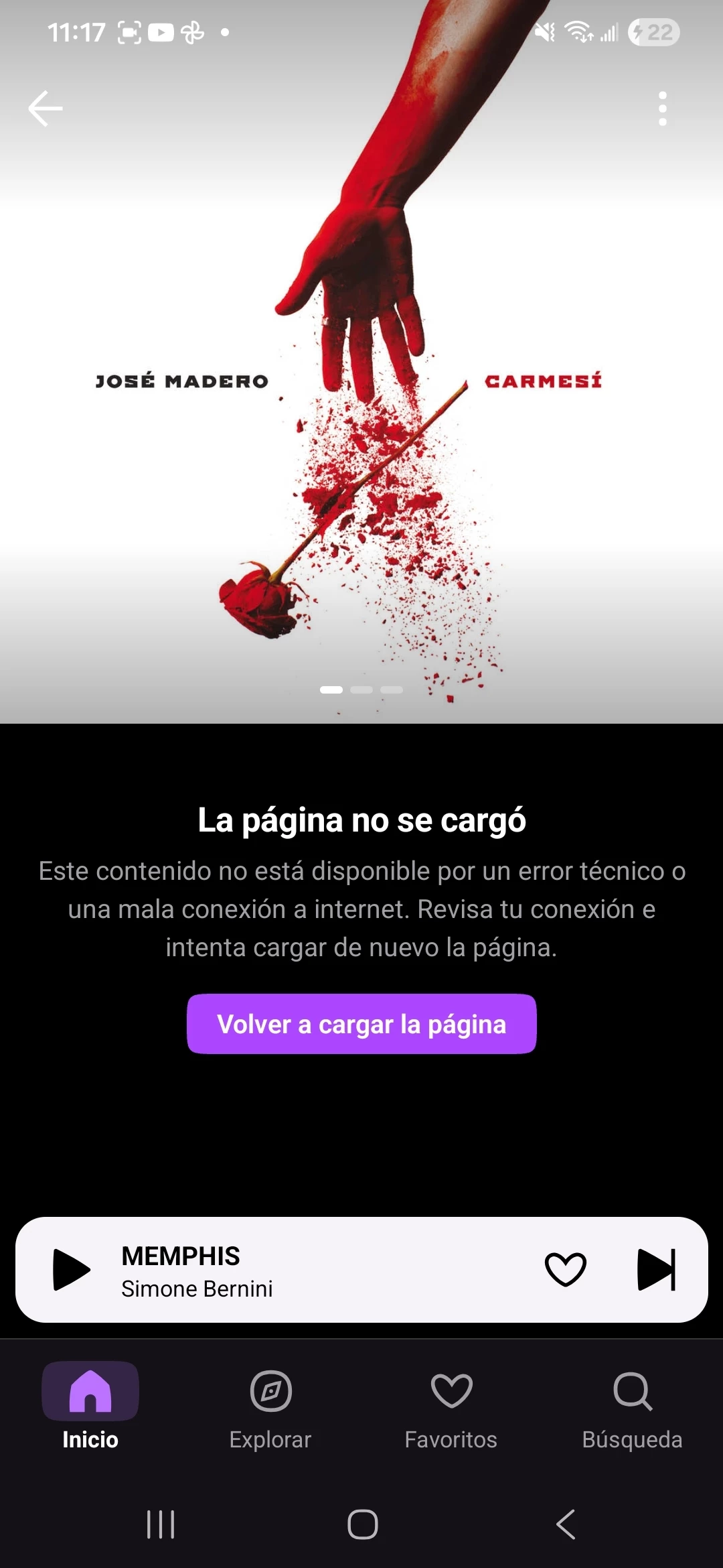 Hay muchas canciones que ya tengo guardadas en mi biblioteca aparecen de un color diferente, al darle play no se reproduce y al ingresar al álbum me aparece un mensaje que dice que la página no se cargo, este contenido no esta disponible debido a un error técnico o una mala conexión a Internet. Revise la conexión e intenta cargar de nuevo la página.