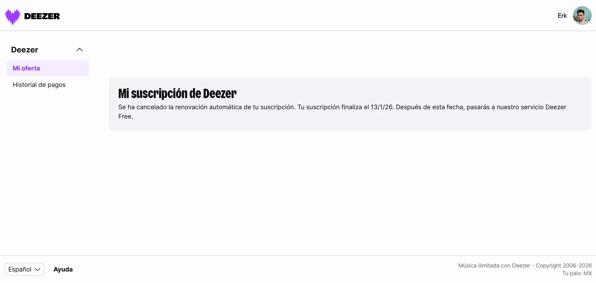 Si no te deja por favor contacta a soporte para que te ayuden con tu cuenta, detallando el problema así como el correo que tienes asociado a tu cuenta, mediante el formulario de contacto Deezer https://support.deezer.com/hc/es/requests/new