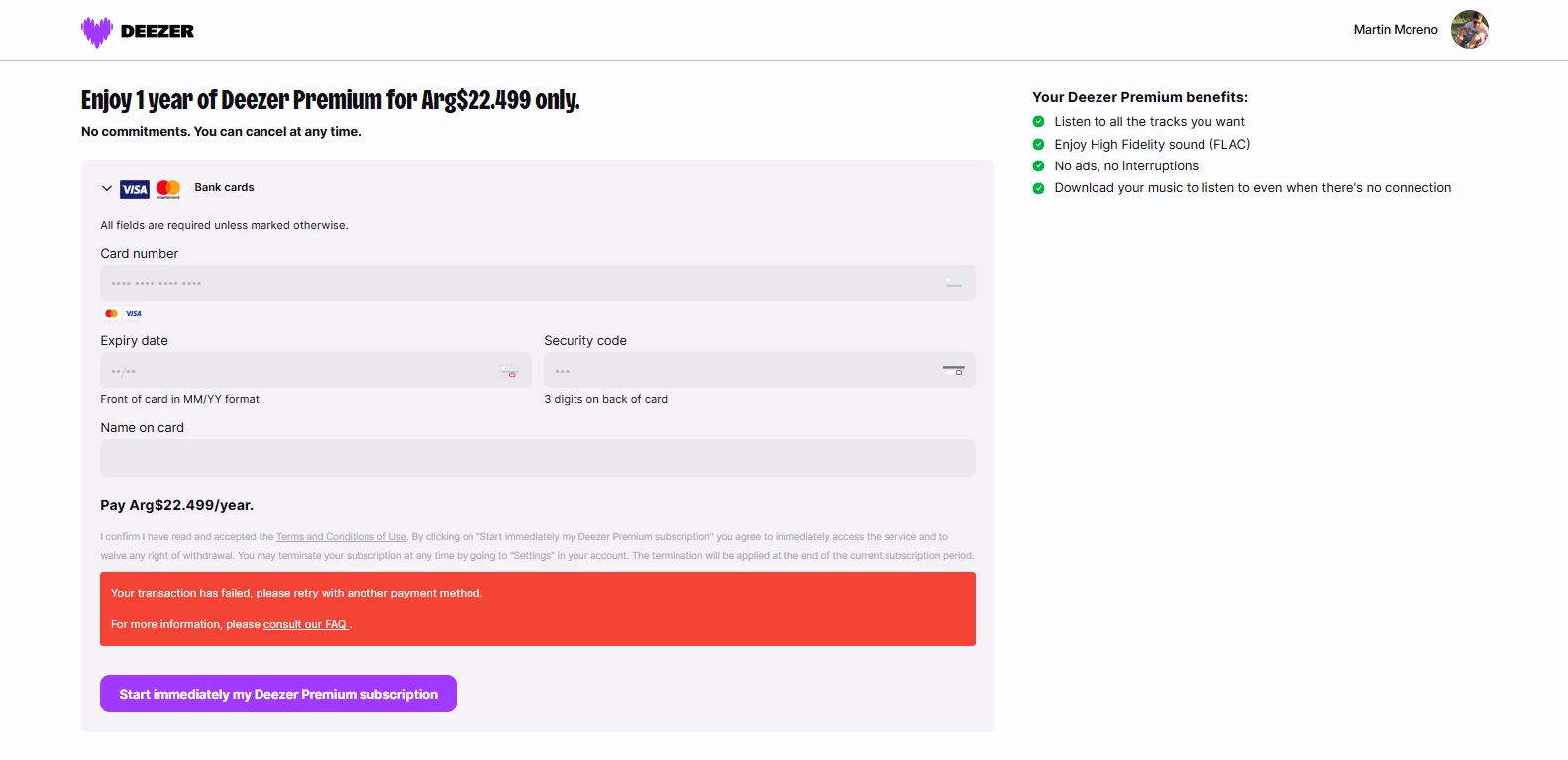 No puedo pagar la suscripción a Deezer Premium Anual!